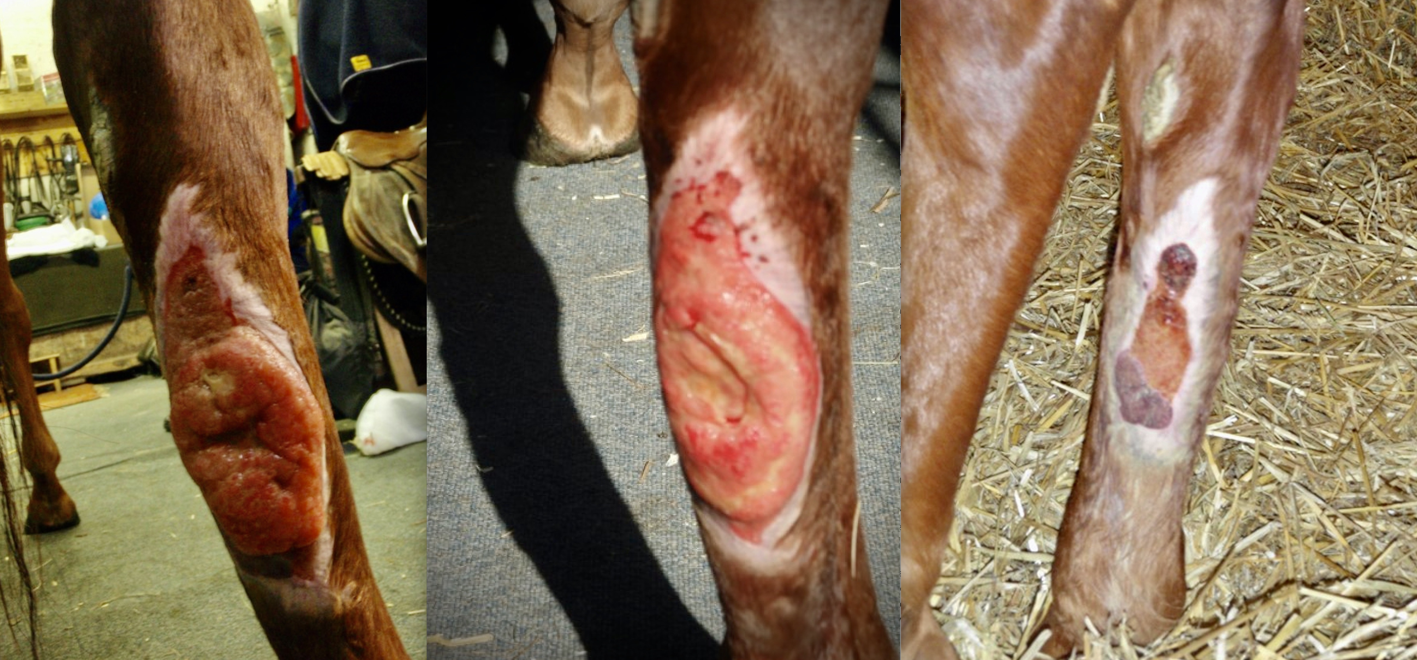 Wundheilung bei Pferden verläuft (leider) manchmal anders als bei den Kleintieren wie Hund und Katze. Viele Pferde haben Probleme bei der Heilung, sei es die Bildung von Phlegmonen bei kleinen Wunden, ein verlangsamtes Zusammenziehen der Wundränder oder auch die Bildung von sogenanntem „wilden Fleisch“ bei klaffenden Wunden. Diese Heilung verläuft je nach Körperregion mal besser oder auch schlechter. Wunden am Kopf, in der Halsregion, am Torso oder auch im oberen Bereich der Beine machen meist wenig bis keine Probleme. An den unteren Extremitäten allerdings kann selbst die kleinste Wunde zu größeren Problemen führen. Warum? Erstens weil die Haut an den Beinen natürlich unter großer Spannung steht. Zweitens gibt es kaum Unterhaut (Subcutis) und drittens liegen diese Wunden oft in Bereichen, die permanent bewegt und/oder belastet werden.