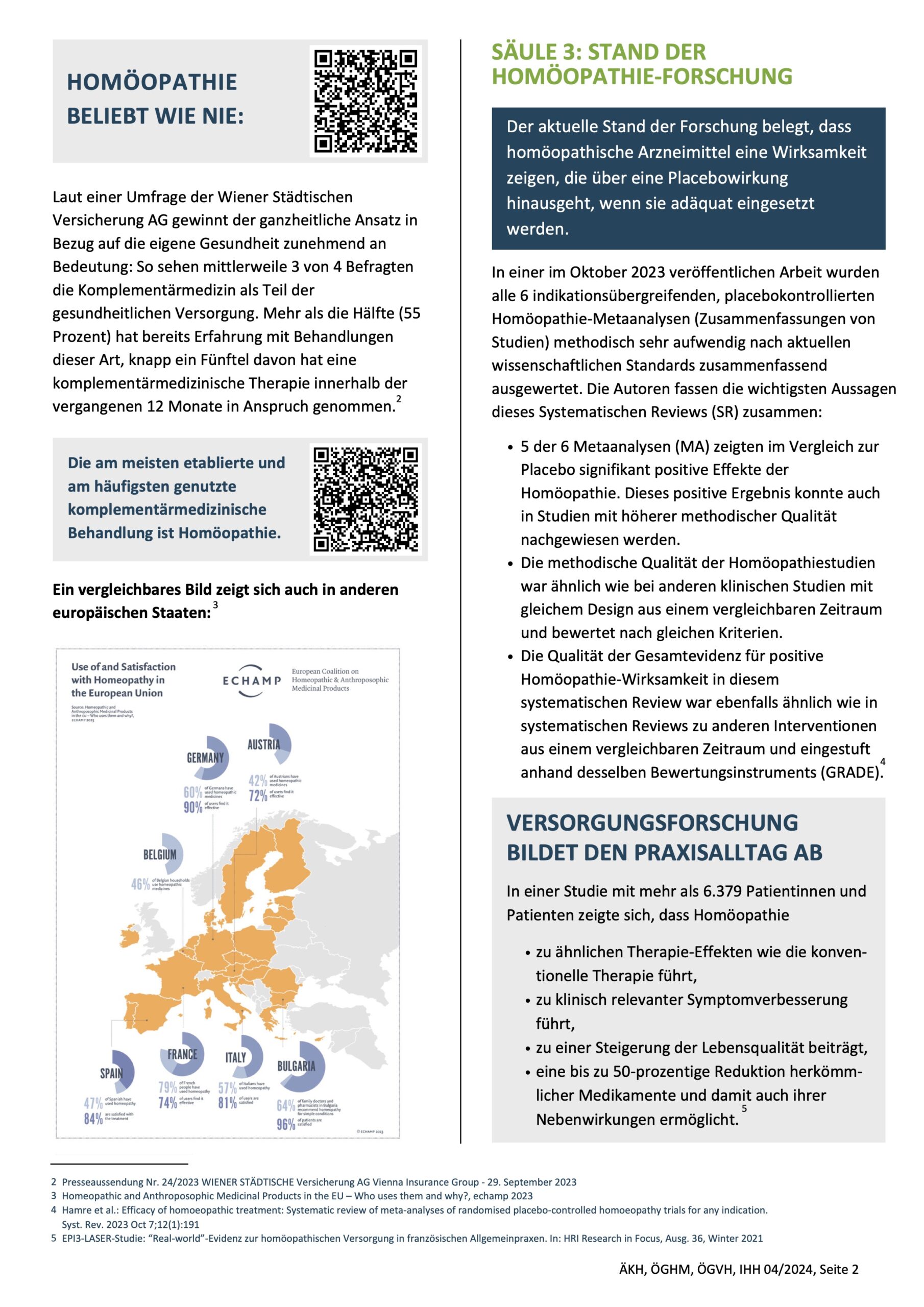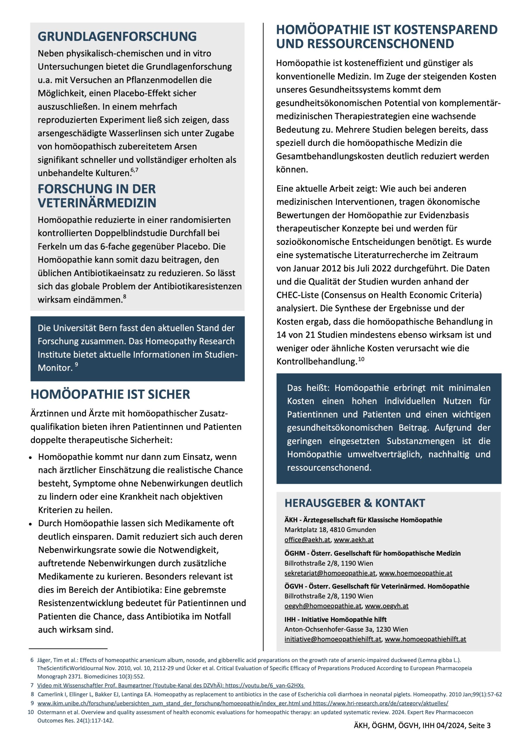 Dieses Faktenblatt stellt Ihnen fundierte, wissenschaftlich geprüfte Informationen zur Verfügung. Die Homöopathie erfüllt die Kriterien der evidenzbasierten Medizin (EbM), welche auf drei gleichwertigen Säulen ruht: der ärztlichen Erfahrung, der Präferenz der Patientinnen und Patienten sowie der externen Evidenz klinischer Studien. Studien belegen nicht nur die Wirksamkeit der Homöopathie, sondern auch deren hohe Sicherheit und Nachhaltigkeit. Zudem zeigt die Forschung, dass Homöopathie durch den verringerten Einsatz herkömmlicher Medikamente einen wichtigen Beitrag zur Gesundheitsökonomie und zu einem verantwortungsvollen Umgang mit Ressourcen leistet.